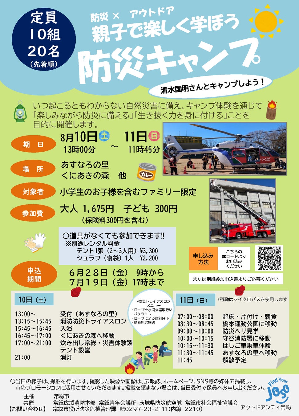 常総市では,いつ起こるともわからない自然災害に備え,防災教育の一環として親子でキャンプ体験を通じて「楽しみながら防災に備える」「生き抜く力を身に付ける」ことを目的に,下記のとおり親子防災キャンプを開催します。
