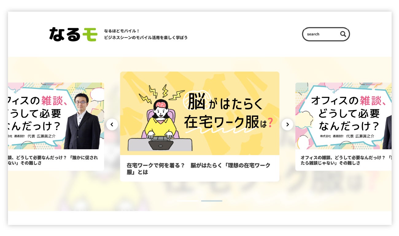 「なるモ」は、「なるほど」と「モバイル」をかけ合わせて名付けられており、モバイル端末の活用を中心とした、ひとりひとりの働き方をより良くするためのアイデアや、世間で話題の最新情報など、ビジネスシーンで広く役立つ情報を発信するWebメディアです。掲載するコンテンツは、仕事の休憩時間や移動時間に、肩の力を抜いて楽しんで読んでもらえるものを予定しており、第1回目と第2回目の記事として、「オフィスの雑談、どうして必要なんだっけ? 『誰かに促されたら雑談じゃない』その難しさ」、「在宅ワークで何を着る? 脳がはたらく『理想の在宅ワーク』とは」を掲載しています。