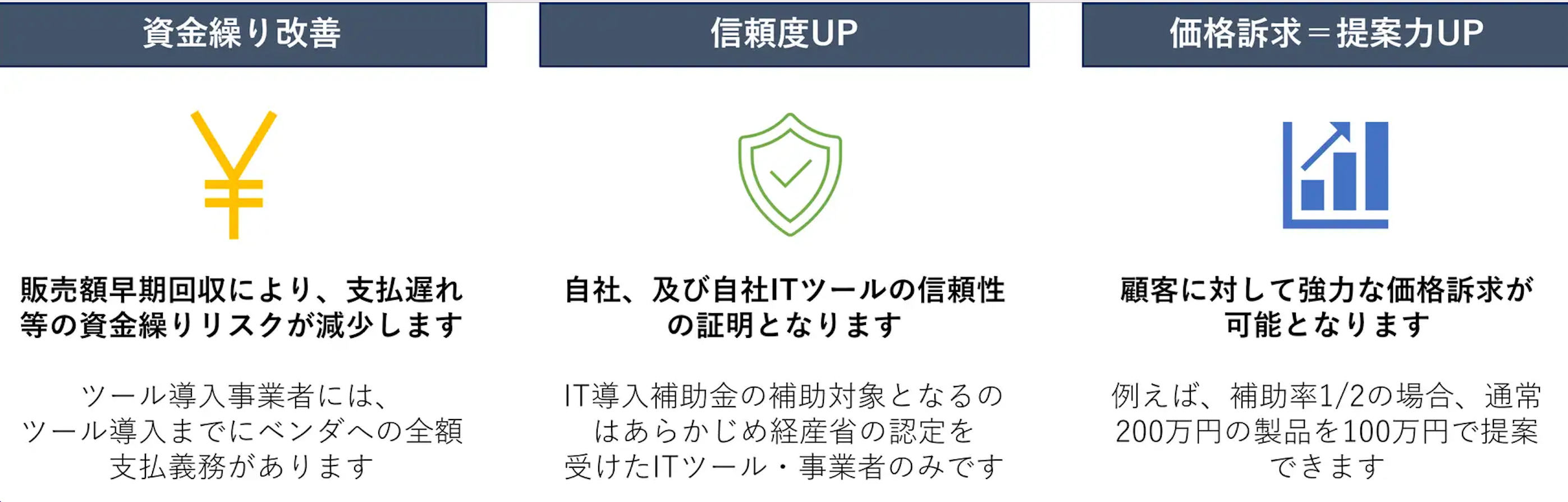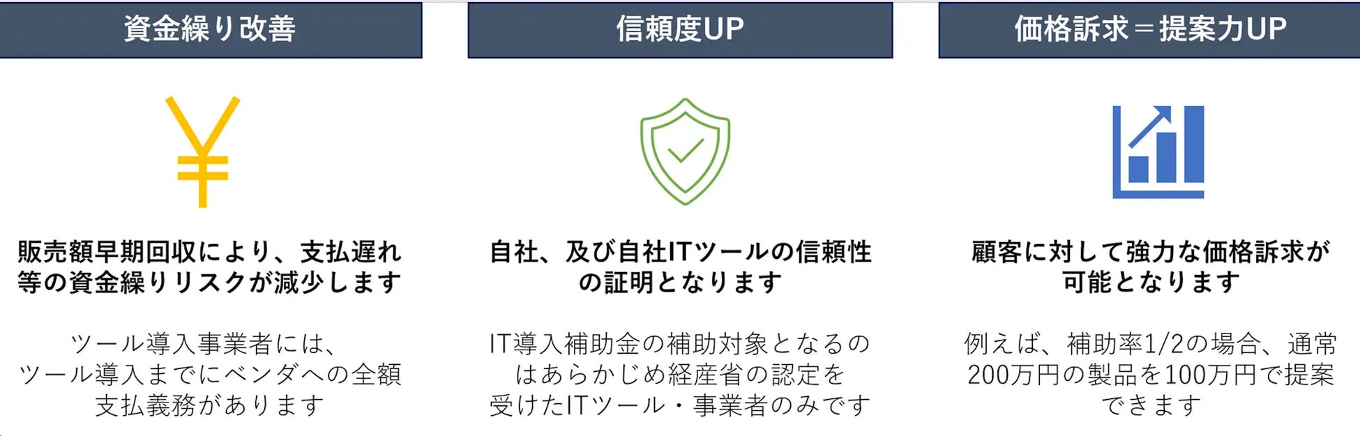 ITベンダーが自社ツールをIT導入補助金の対象ツールに登録することで、資金繰り改善・信頼度UP・提案力UPに繋がります。