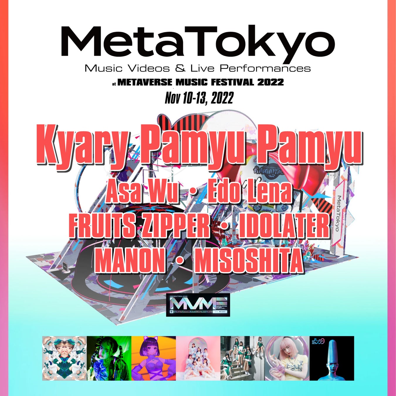 メインステージには新しい学校のリーダーズが出演し、MetaTokyo株式会社(本社:東京都渋谷区、代表取締役社長:鈴木貴歩、以下MetaTokyo)がプロデュースする「MetaTokyoステージ」には、きゃりーぱみゅぱみゅ、FRUITS ZIPPER、江戸レナ、MISOSHITAをはじめ多数のアーティストが登場します。