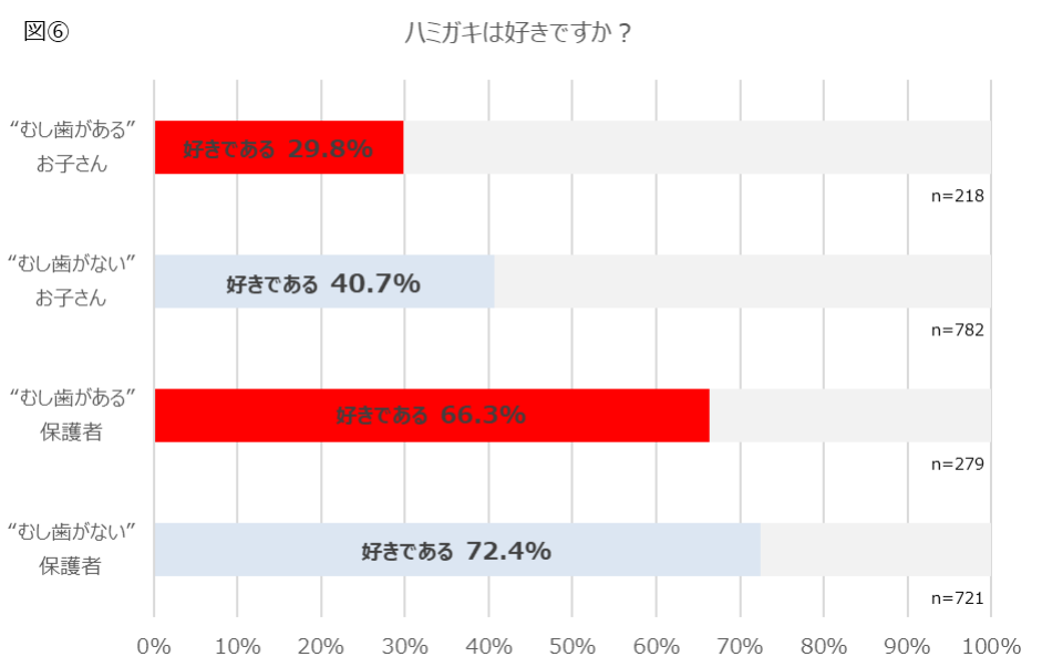 お子さんについての【ハミガキの状況】を聞いたところ、「ハミガキが苦手」と回答したのは、“むし歯がある”お子さんのうち 62.8%、“むし歯がない”お子さんのうち 37.6%でした。[図⑤]また、【ハミガキが好き】かどうかを聞いたところ、「好き」と回答したのは、“むし歯がある”お子さんのうち 29.8%、“むし歯がない”お子さんのうち 40.7%でした。保護者自身については、自身に“むし歯がある”保護者のうち 66.3%でしたが、自身に“むし歯がない”保護者はそれより多い 72.4%でした。[図⑥]