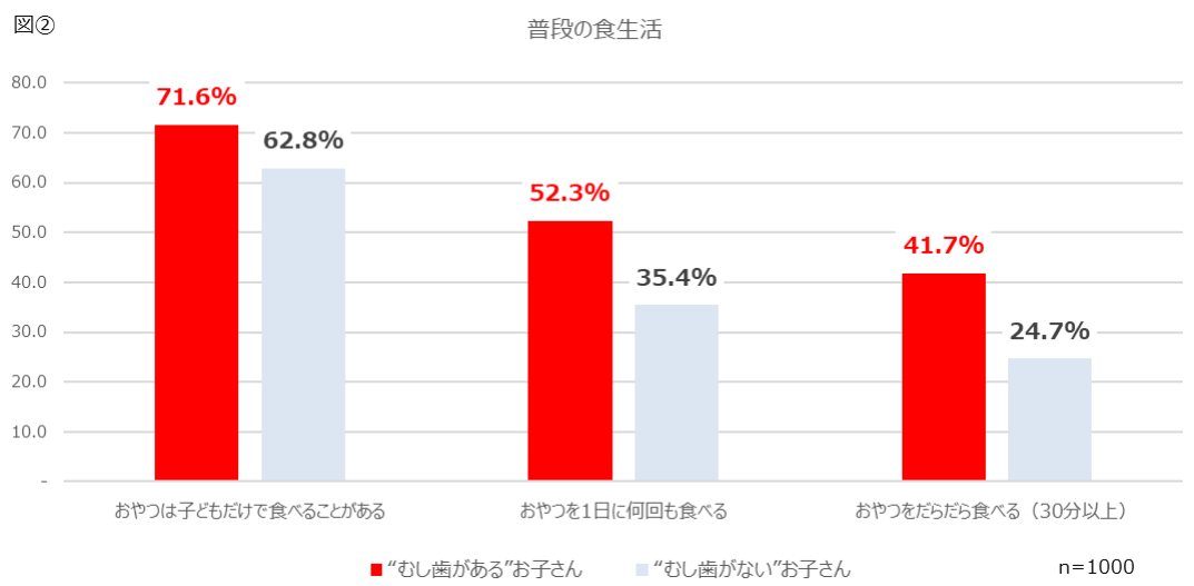 そんな環境の変化がある中【普段の食生活】の質問では、「おやつは子どもだけで食べることがある」と回答した人は“むし歯がある”お子さんのうち 71.6%でした。また、「おやつを 1 日に何回も食べる」と回答したのは、“むし歯がある”お子さんのうち52.3%で、“むし歯がない”お子さんのうち 35.4%という結果との差がでました。「おやつをだらだら食べる」と回答したのも、“むし歯がある”お子さんのうち 41.7%で、“むし歯がない”お子さんのうち 24.7%という結果とこちらも差がみられます。[図②]