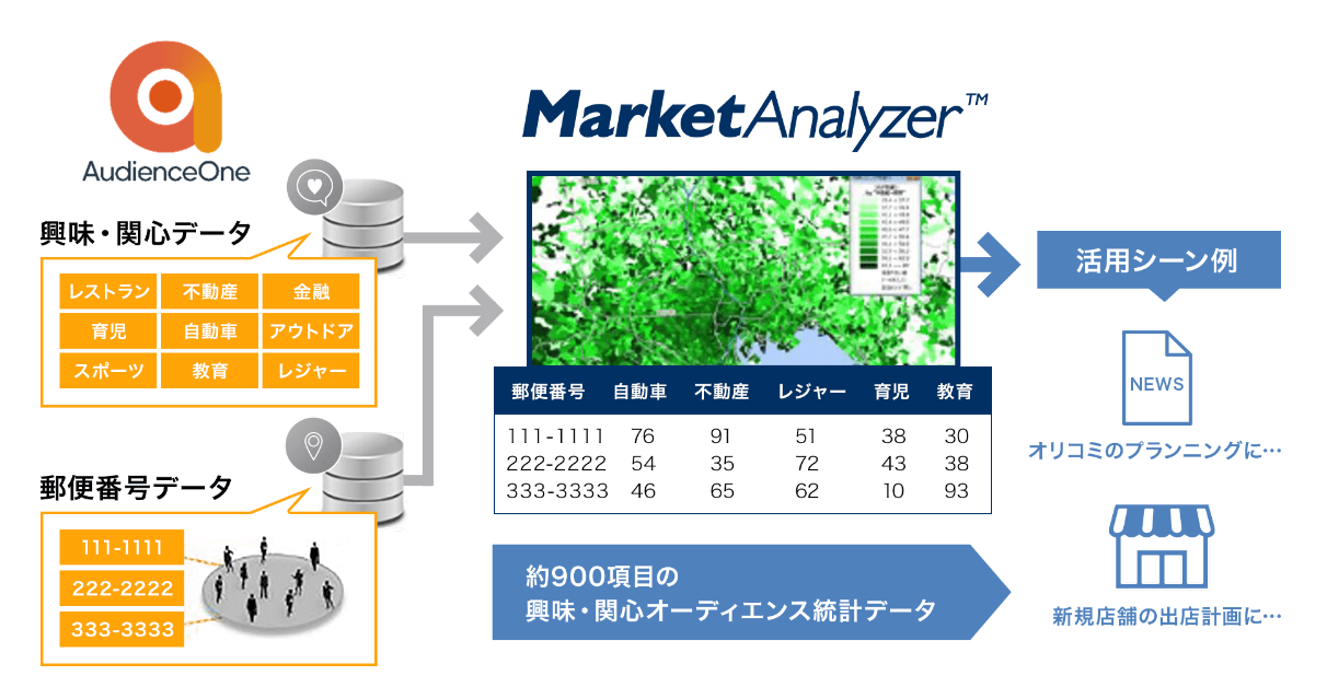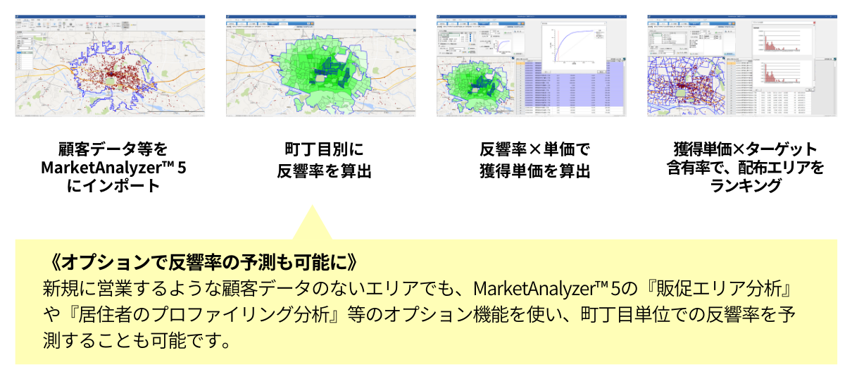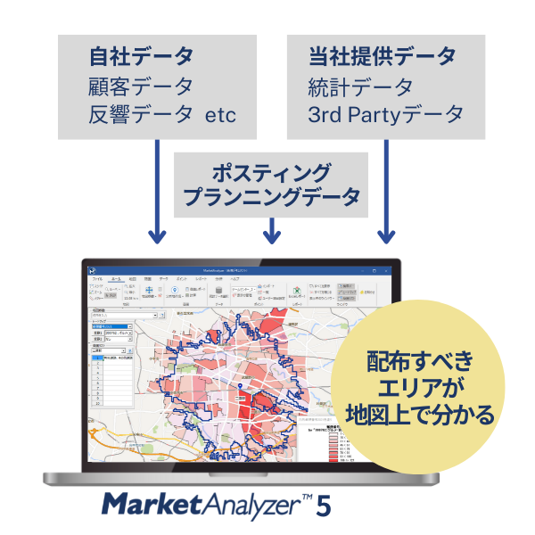 MarketAnalyzer™ 5は、顧客住所や反響のあったエリア情報等の自社データをインポートでき、世帯数や住宅種別、年収、消費傾向などの各種統計データや、居住者のライフスタイルや興味・関心、価値観を狭小エリア毎に把握できるデータなど、様々なデータと掛け合わせ、自社のターゲットに沿ったロジカルな配布エリアの選定が可能になります。