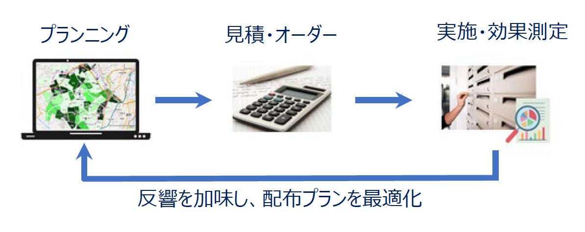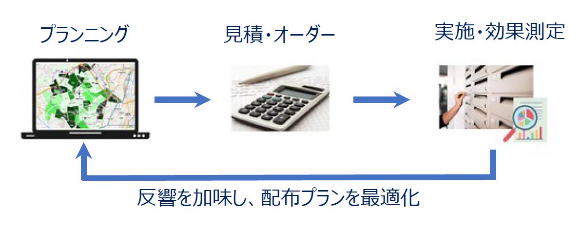 顧客ペルソナの分析、配布エリアの選定などのプランニングから、見積、発注、実施、効果測定まで、一気通貫で実施できます。反響の状況を次の施策に活かしていくことで、ポスティング施策の最適化を支援します。