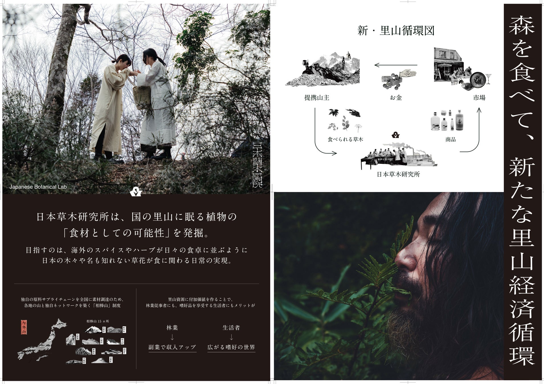日本草木研究所が目指すのは、日本の木々や名も知れない野草たちが当たり前に食卓や生活の中に関わる日常の実現。 日本の原始的な食用植物資源の価値化は、地方産業の活性化や持続可能な食材供給、新たな国際競争力にも繋がっていく。 それらを実現するために今日も全国の里山に入っては、蒐集・記録・発表を繰り返し、おいしい価値化を試行するブランドです。