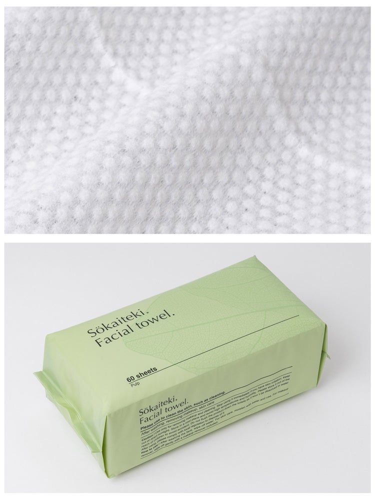 「Sokaitekiのフェイシャルタオル」は、肌触りの良い、贅沢な天然素材パルプ100%を使用しています。毛羽立ちにくい素材で、繊維が肌に残りにくいので、繊維による肌トラブルを防ぎます。ティッシュやキッチンペーパーと比較にならないほどの贅沢な使い心地です。