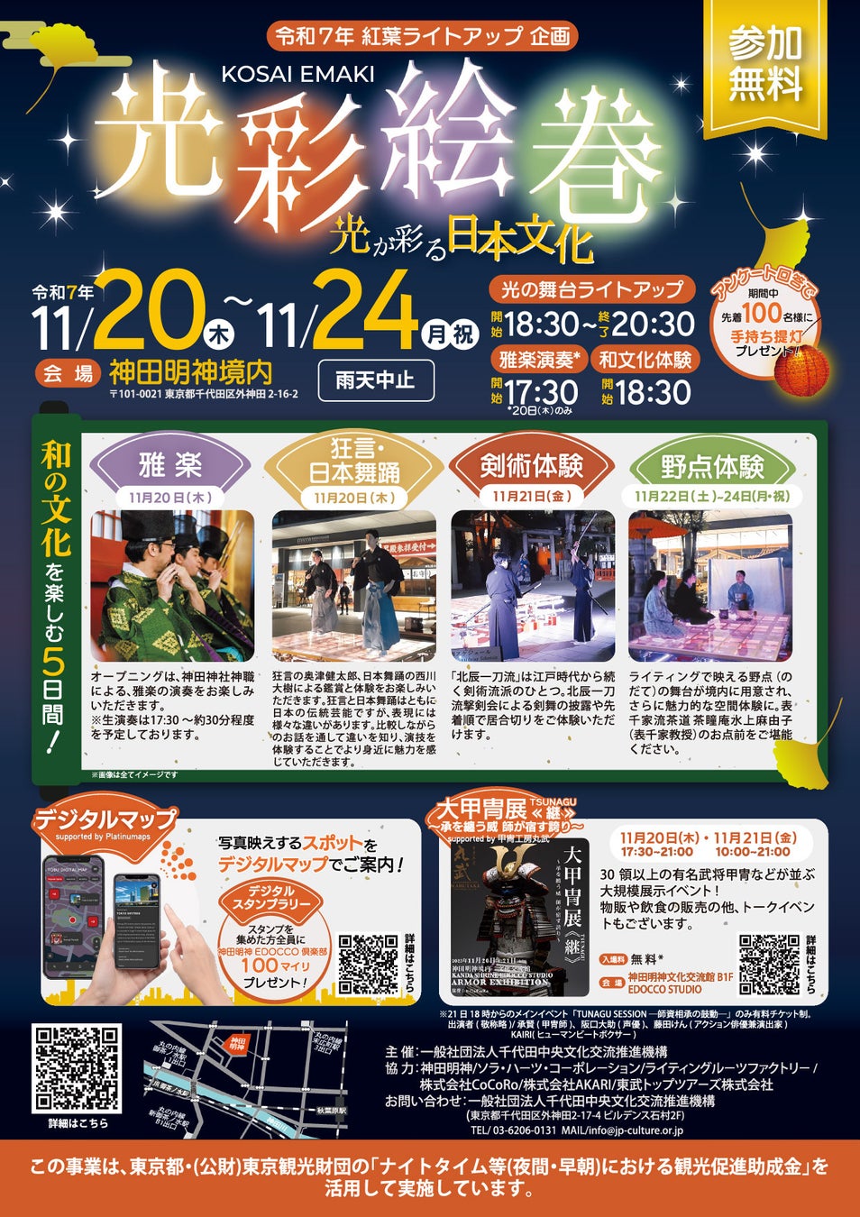 一般社団法人千代田中央文化交流推進機構(東京都千代田区外神田2-17-4 代表理事:清水祥彦)は、「神田明神 光彩絵巻 ~光が彩る日本文化~」を令和7年11月20日〜11月24日まで、神田明神境内にて開催します。