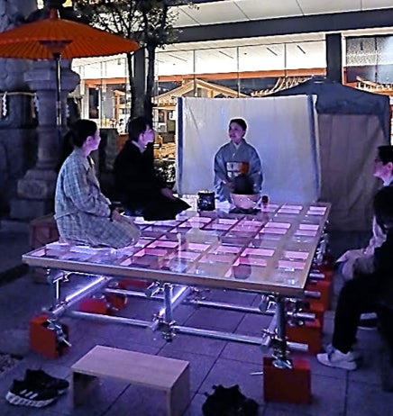 ライティングで映える野点 (のだて)の舞台が境内に用意され、さらに魅力的な空間体験を提供いたします。表千家流茶道 茶瞳庵水上麻由子(表千家教授)のお点前をご堪能ください。