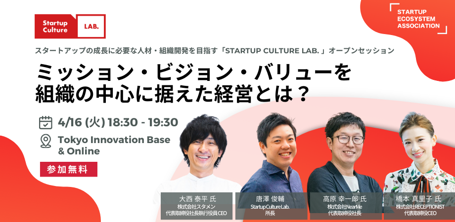 テーマは「ミッション・ビジョン・バリューを組織の中心に据えた経営とは?」。「ミッション・ビジョン・バリュー(MVV)」の重要性が語られるようになって久しくなりました。このセッションでは、なぜ、スタートアップにはMVVが必要なのか?本当に効果があるのか?ということを改めて経営者と議論を深めます。また、MVVをどう策定し、どう浸透させるのか、具体的な取組みから現状の課題まで、具体的に検討します。今回は多様な経験を持つスタートアップ経営者の方々にお集まりいただき、経営視点でMVVについて議論します。