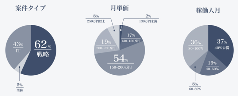 - [稼働人月] “副業”向けの4割未満稼働、もしくは”フリー・ブティックファーム”向けの8割以上稼働の案件が中心
