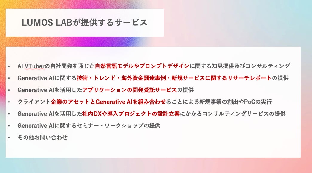 Generative AIコンサルティング&研究開発『LUMOS LAB』が提供するサービス