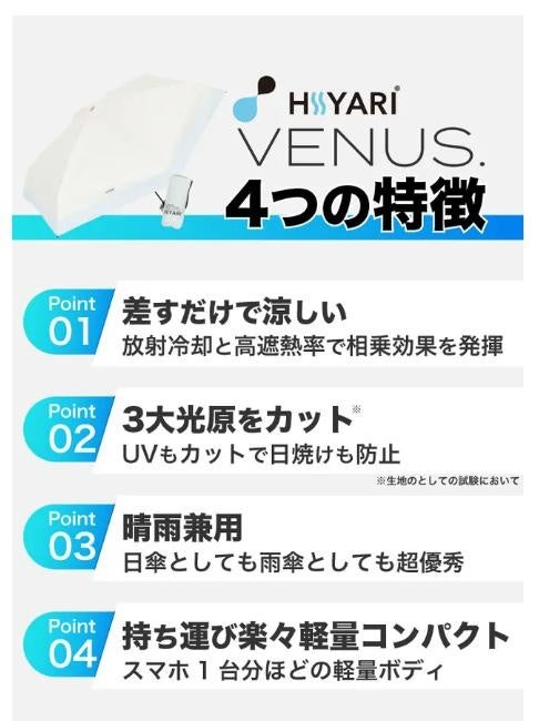 【SDGs】日傘の女王®誕生。いよいよ夏本番!猛暑と天候急変に晴雨兼用「二刀流」傘で対応。HIYARI VENUS. 放射冷却×100%遮光 2024年、放射冷却のチカラで、遂に日傘は新しい時代へ。