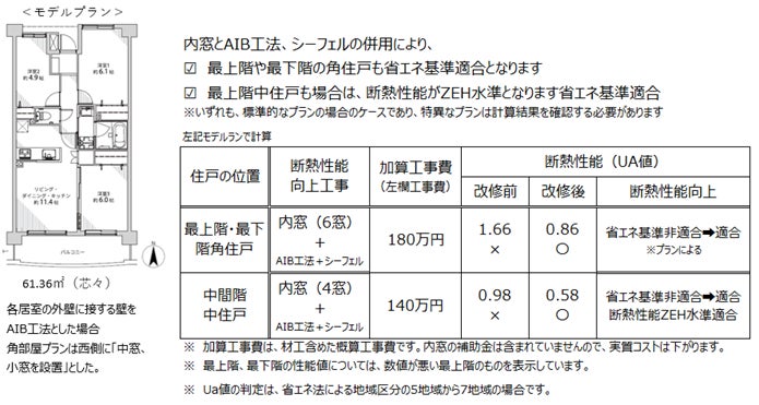 樹脂窓などの内窓、AIB工法(壁の断熱)とシーフェル(床断熱)の併用により、マンションにおいて条件的に厳しい最上階角住戸、最下階角住戸でも「省エネ基準適合」が可能です。更に中間階中住戸では、断熱性能に関してZEH水準も可能(5地域から7地域の場合)となります。
