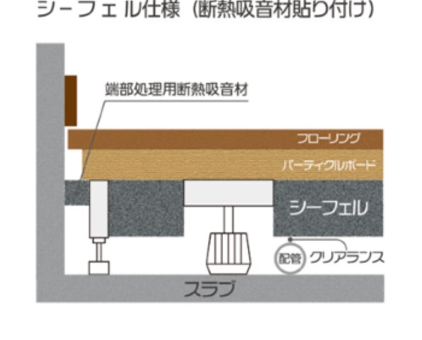 シーフェルとは、マンションで床下空間がある場合、「床のボード裏に高性能な断熱材を貼り付ける」工法です。当工法は、床下の取合部に関して連通性を止めるための処理が必要です。(※特許出願中)