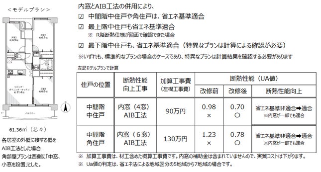 樹脂窓などの内窓とAIB工法との併用により、マンションの中間階中住戸はもとより、中間階角住戸や最上階‧最下階の中住戸において「省エネ基準適合」が可能となります。(5地域から7地域の場合)