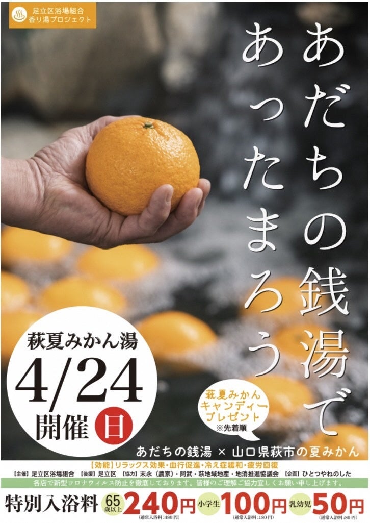 ・4月24日(日)、足立区の銭湯25軒(休業中2軒をのぞく全銭湯)で「萩夏みかん湯」が実施されます。