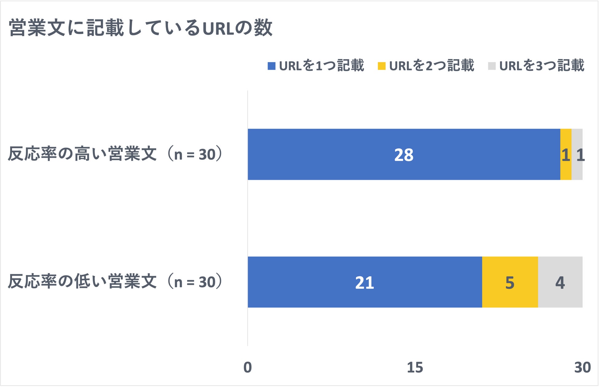 ・営業文の中に記載されているURLの数を調査したところ、「反応率の高い営業文」は「反応率の低い営業文」と比較してURLの数が少ない傾向にあることがわかりました。このことから、「反応率の高い営業文」ではURLの数を絞り込むことで内容を簡潔にし、より反応を得ている様子が窺えます。