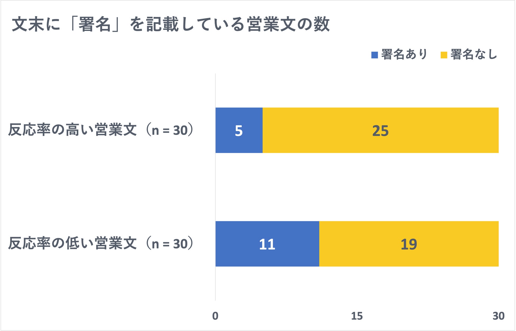 ・文末に「ビジネスメールのような署名」を記載している営業文の数を調査したところ、「反応率の高い営業文」は「反応率の低い営業文」と比較して、署名を記載しない傾向にあることがわかりました。このことから、平均文字数の違いと同様に「反応率の高い営業文」の方が簡潔に記載している様子が窺えます。