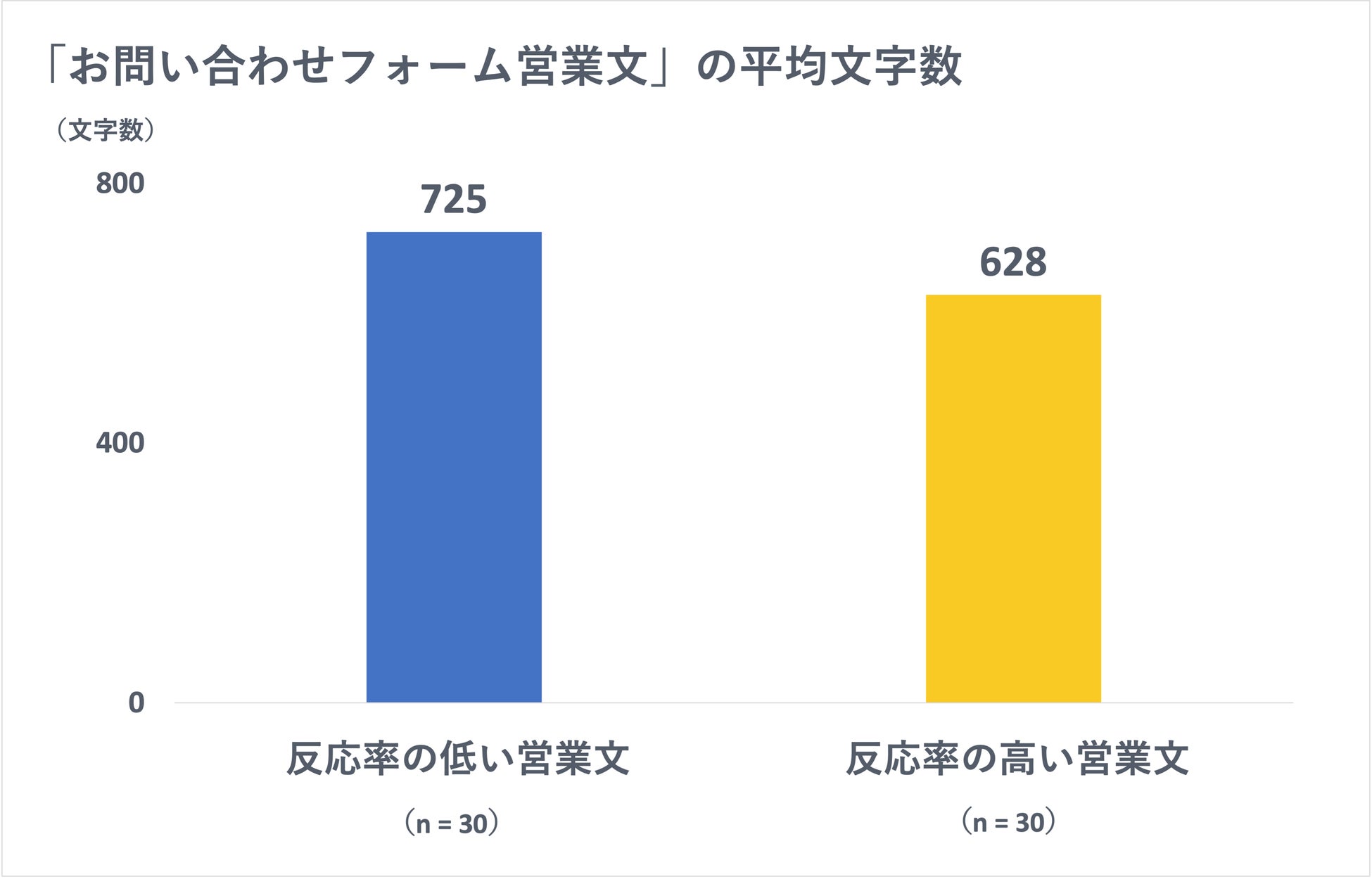 「反応率の低い営業文」の平均文字数が725文字であるのに対し、「反応率の高い営業文」の平均文字数は628文字と100文字ほど少ない傾向にあることがわかりました。このことより、「反応率の高い営業文」では628文字程度におさめることで営業文を簡潔に記載し、受け取り手が読みやすくなることで反応率の向上につながっていることが推察できます。
