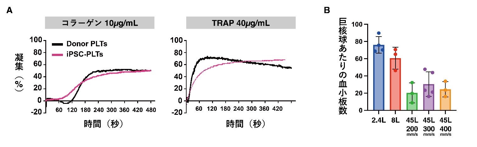 A. 凝集を誘発するコラーゲン(左)およびトロンビン受容体アゴニストペプチド(TRAP)(右)を作用させた場合の凝集の形成率。黒い線は生体由来の血小板を用いた結果。ピンク色の線は45L容量の上下動式培養装置で作製したiPS細胞由来の血小板を用いた結果。