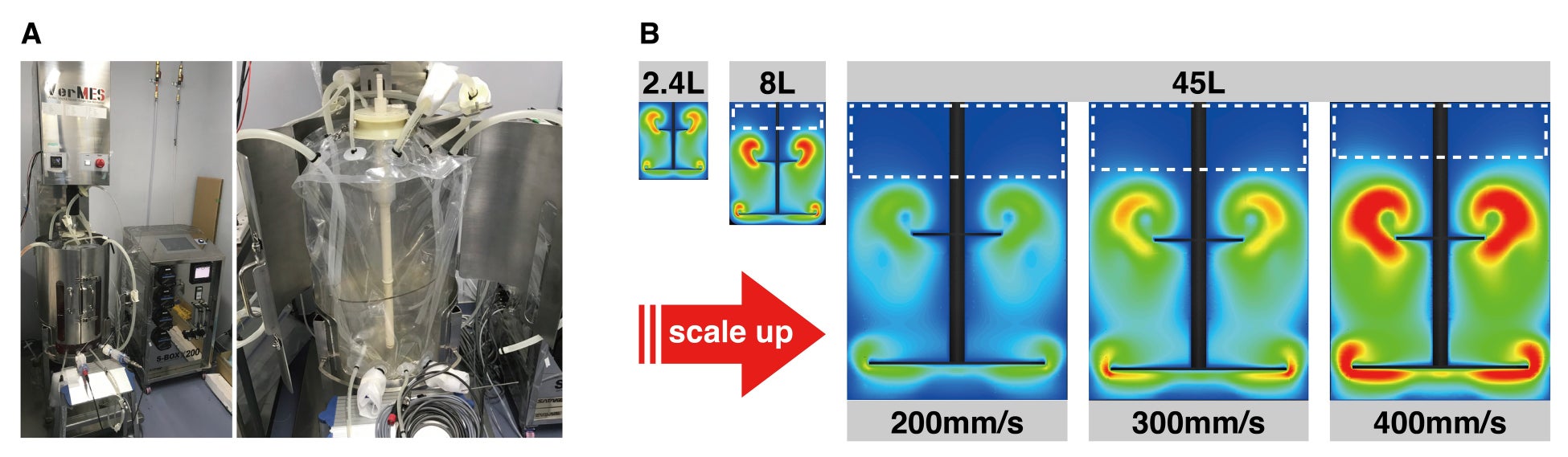 この45L容量の上下動式培養装置を実際に稼働させ、実環境でのブレード速度に応じた、流体制御のシミュレーションに適用することで、従来の8L容量と同程度の乱流エネルギーを実現するブレード速度(毎秒200、300、400ミリメートル;200mm/s、300mm/s、400mm/s)を確認しました(図1B)。