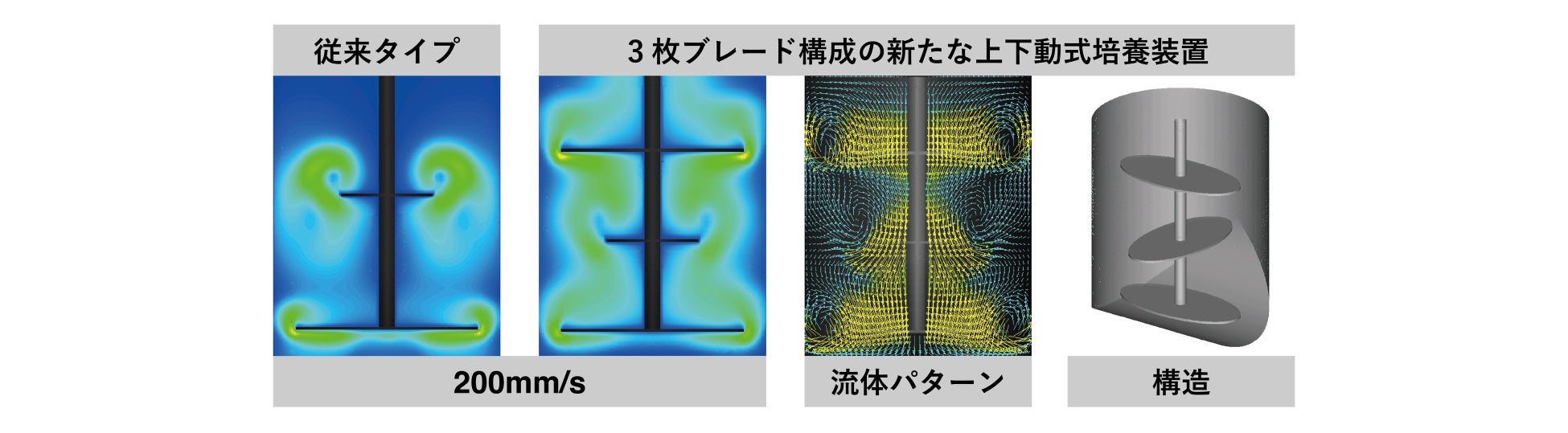 そこで、研究グループは、物理パラメータのシミュレーションを用い、培養槽の容量を拡大しても乱流を効率よく発生させる上下動式の3枚ブレード構成による培養装置(図3)を新たに設計しました。