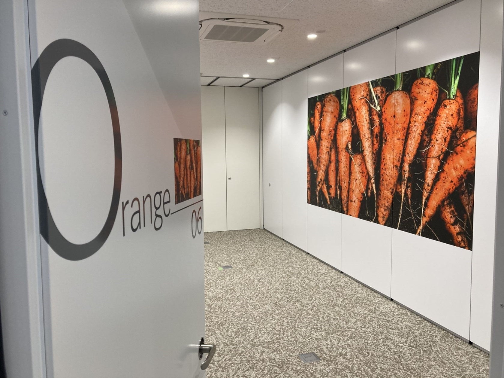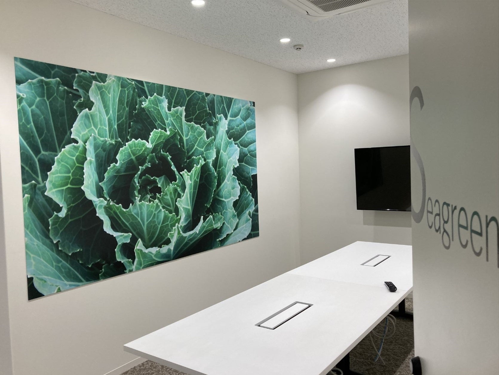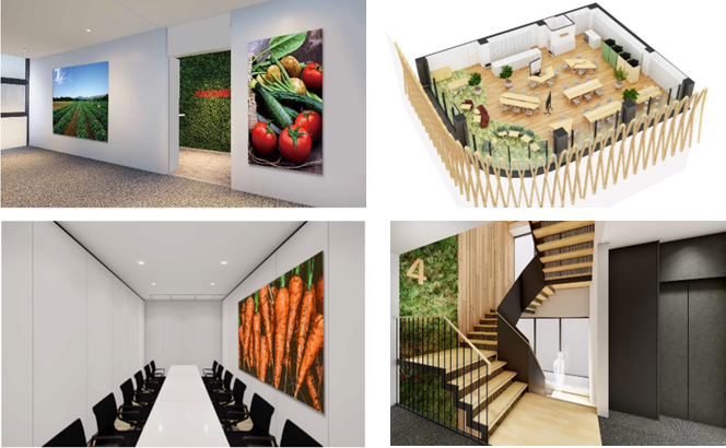 ① 受付や会議室は「野菜の会社」で働いていることを実感できるデザイン、また執務フロアは木目調をベースとしたナチュラルなデザインとしており、従業員のモチベーション向上とリフレッシュを図ります。