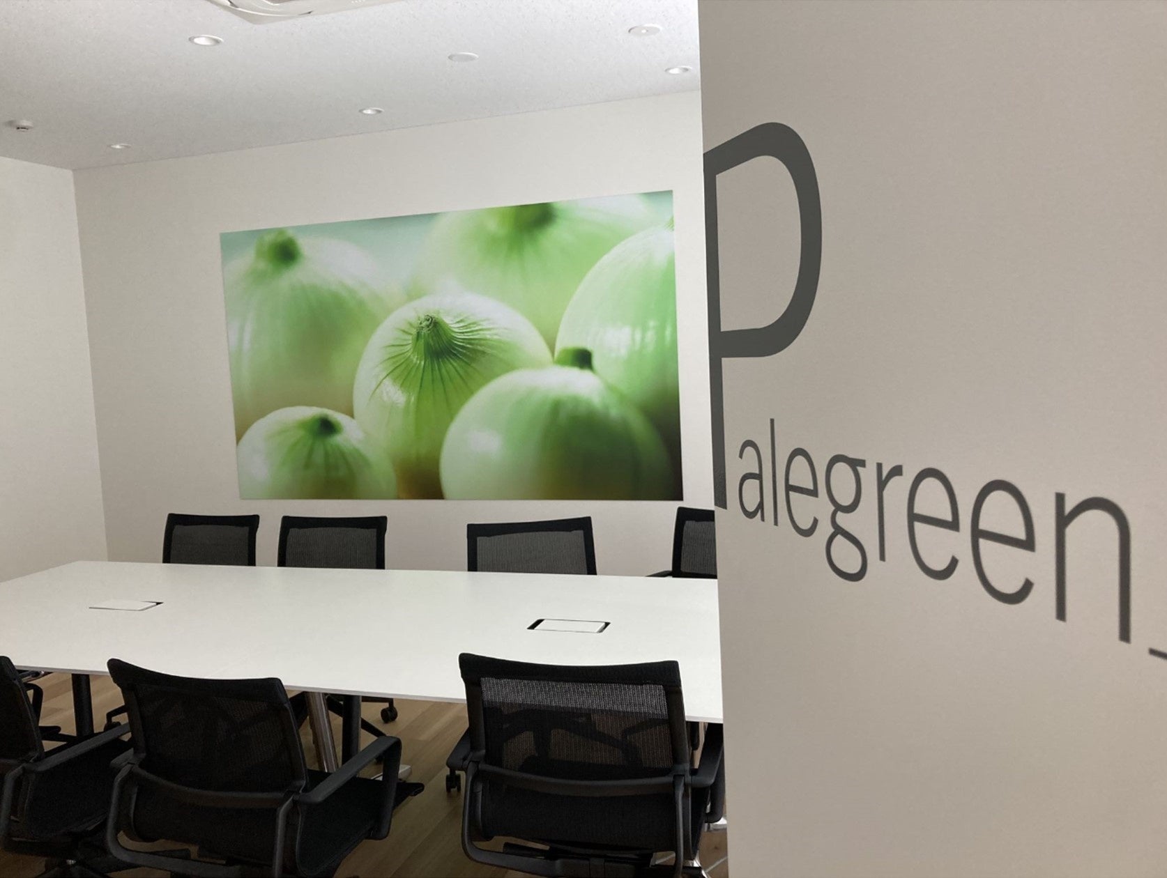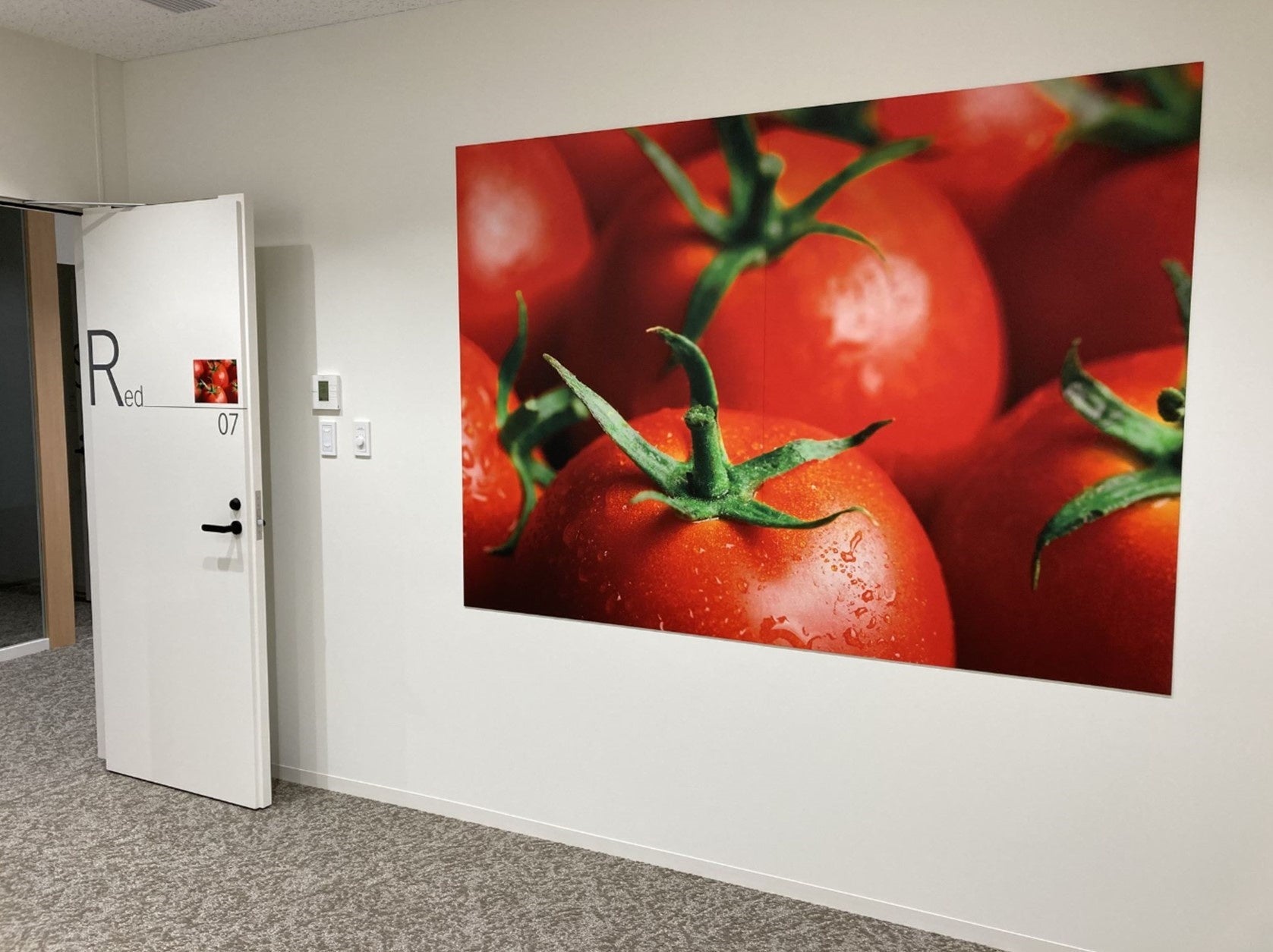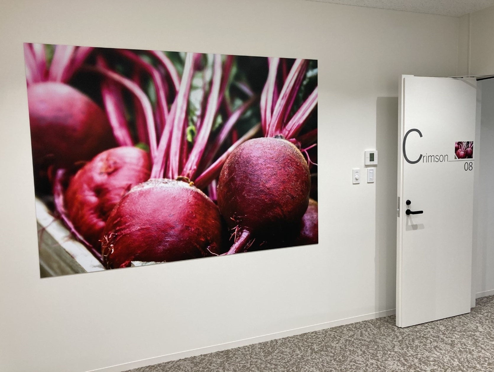 ① 受付や会議室は「野菜の会社」で働いていることを実感できるデザイン、また執務フロアは木目調をベースとしたナチュラルなデザインとしており、従業員のモチベーション向上とリフレッシュを図ります。