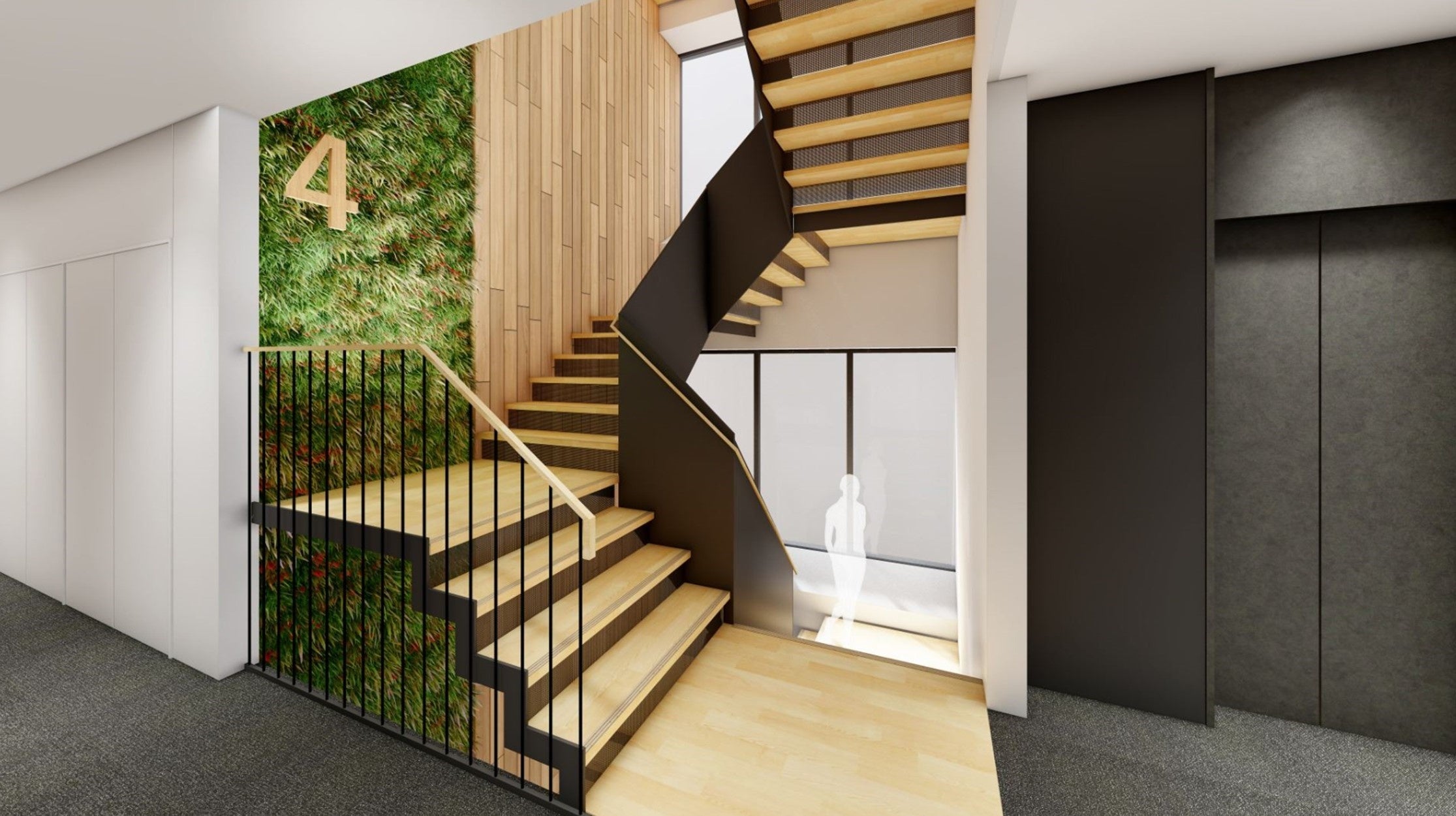 ⑤ 自然を感じながら適度な運動を促進するために、1階から5階の階段は、ナチュラルなデザインを採用した「健康階段」。