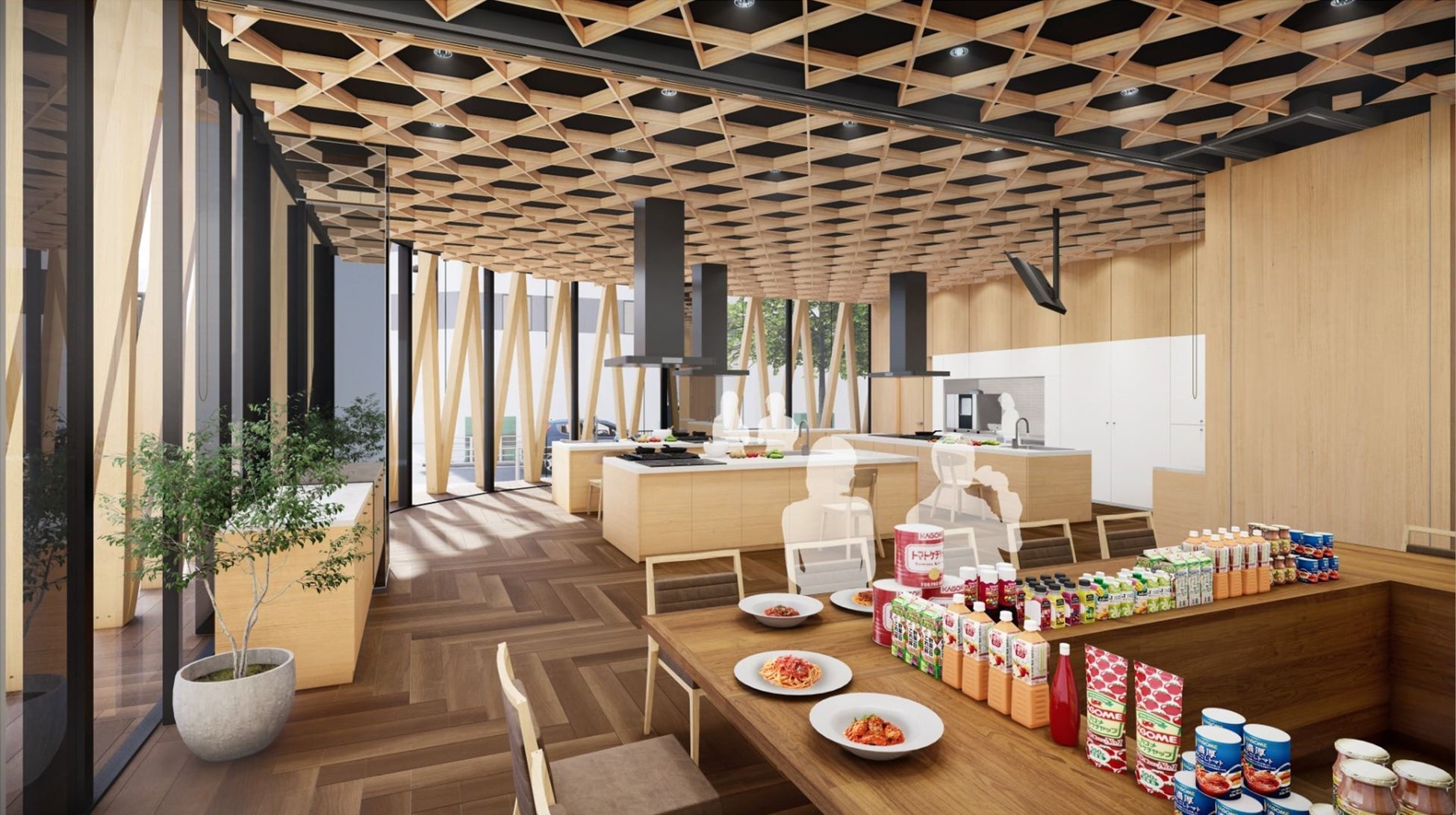 ① 建物低層部の外観や1Fのキッチン空間「カゴメ キッチンファーム🄬名古屋」の内装は、社名「カゴメ」の由来であるトマトを収穫する際の「籠(かご)の目」をモチーフとしております。当社は空間デザインによるコーポレートブランディングの推進にも注力しておりキッチンの内装は意匠出願(※)をしています。