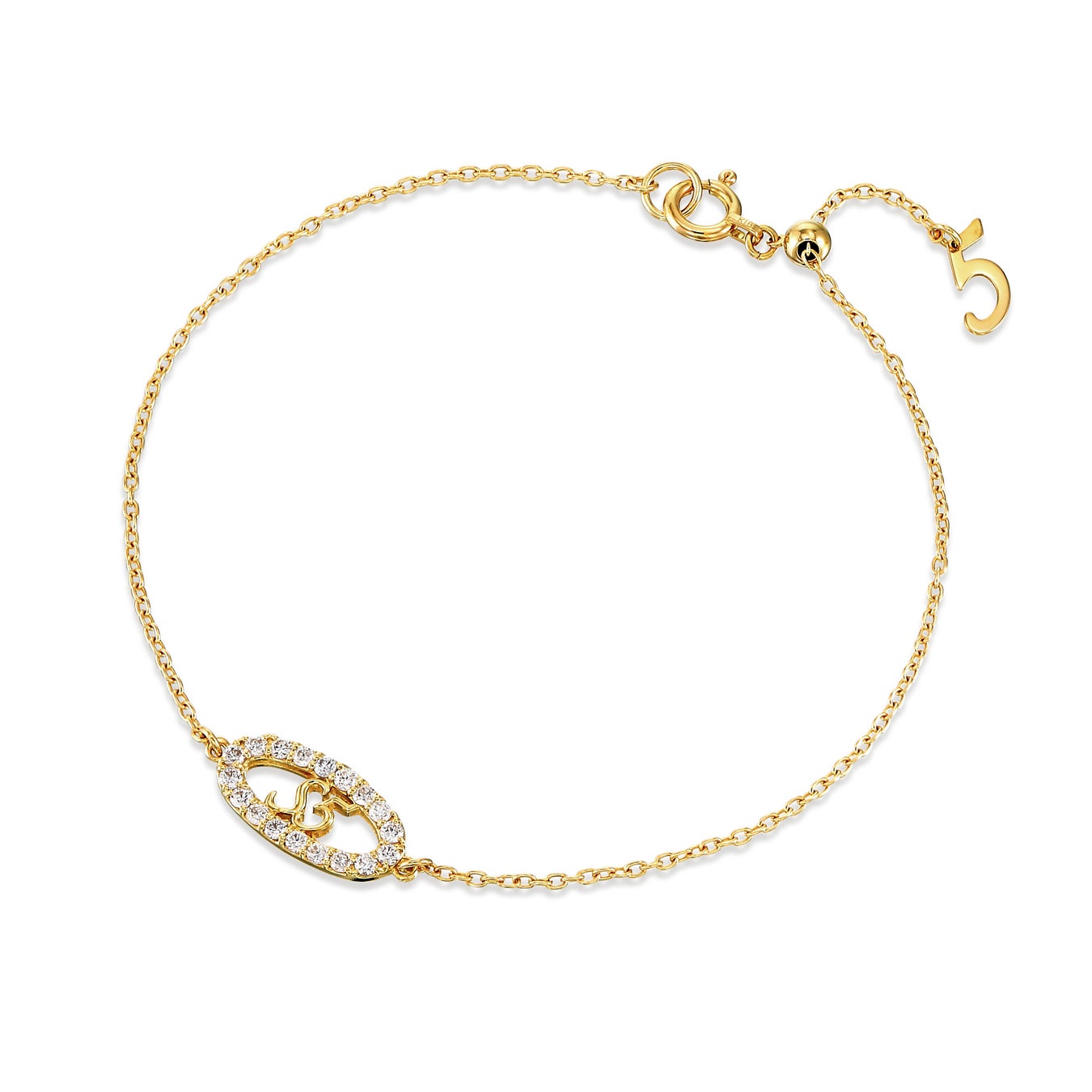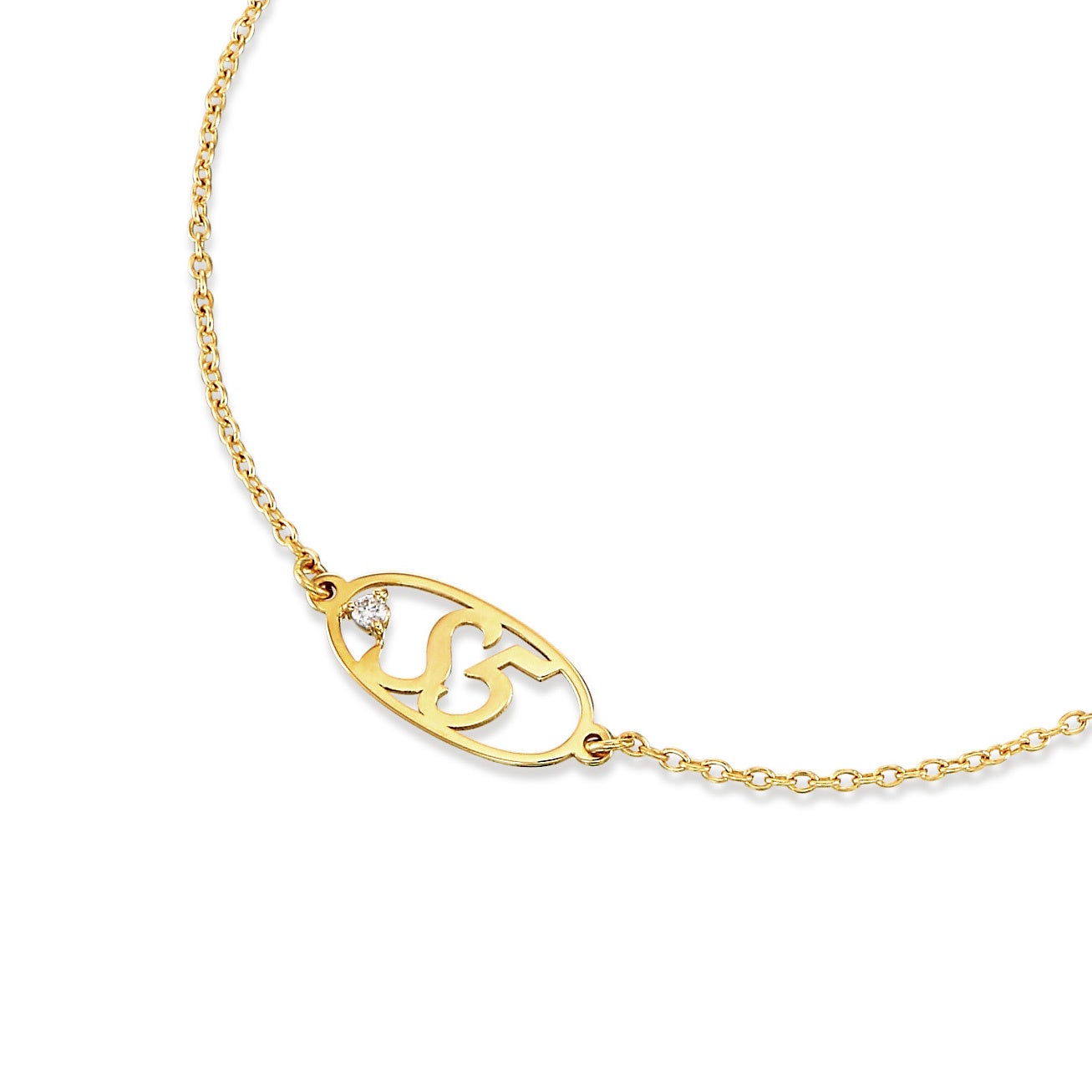 ブレスレットトップ部分 5㎜×10㎜の楕円形の中にS5をあしらい0.012ctのラボグロウンダイヤモンドを一粒使用した、どんなコーディネートにも合わせやすいシンプルなブレスレットです。18金、全長17㎝調整可能なスライドチェーンなので、誰でも簡単に装着可能、ご自分のお好きな長さに合わせてお使いいただけます。