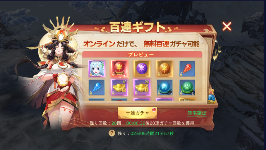 オンライン時間が60分以上、かつレベル30以上のプレイヤーが参加可能。100連ガチャでレア霊獣「清露蓮仙」などのアイテムをゲットできるチャンス!