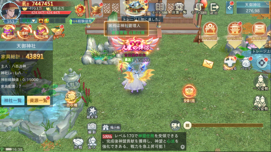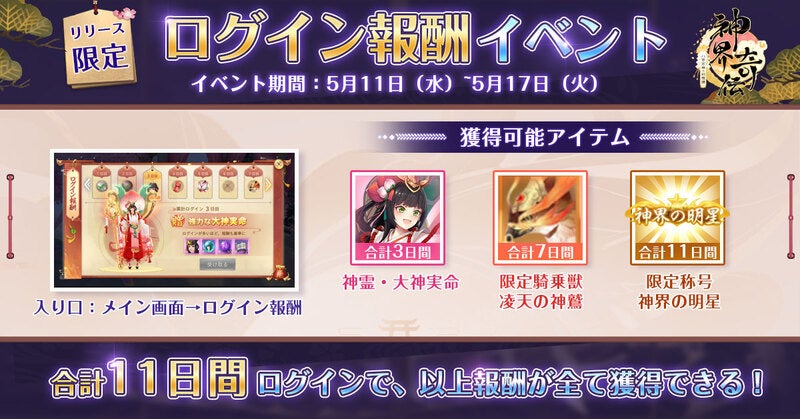 合計3日間ログインで神霊「大神実命」、合計7日間ログインで限定騎乗獣「凌天の神鷲」、合計11日間ログインで限定称号「神界の明星」を入手!
