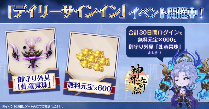 合計30日間ログインで無料元宝×600と御守り外見「虬竜冥珠」を入手 !