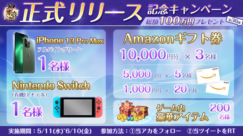 より、公式Twitterでは、「総額100万円分プレゼント」に合わせ、正式リリース記念キャンペーンを開催致しました。Amazonギフト券、iPhone 13 Pro MaxやNintendo Switchなど、豪華賞品が沢山用意されています。是非公式Twitterをフォローして、キャンペーンにご参加ください。