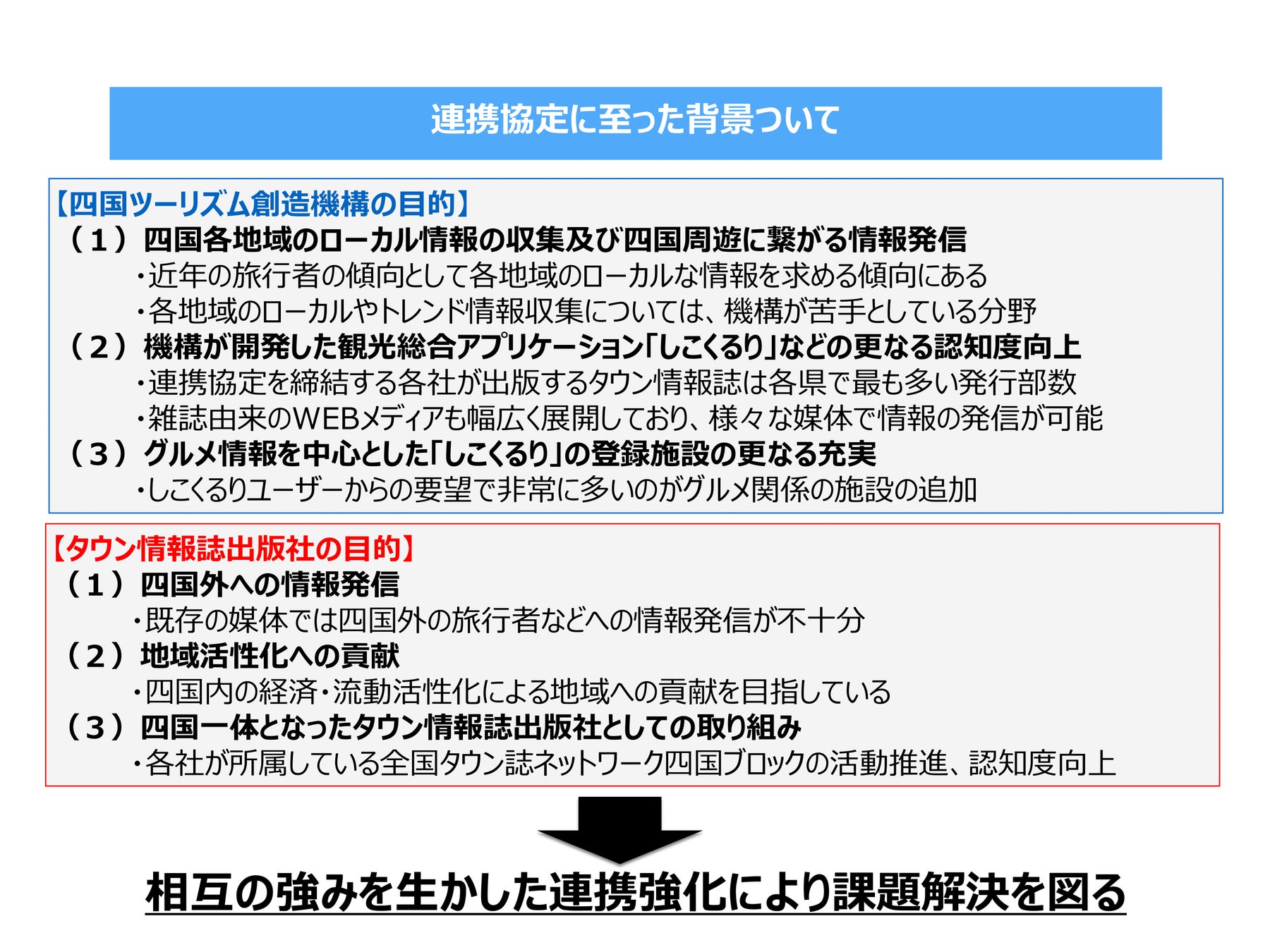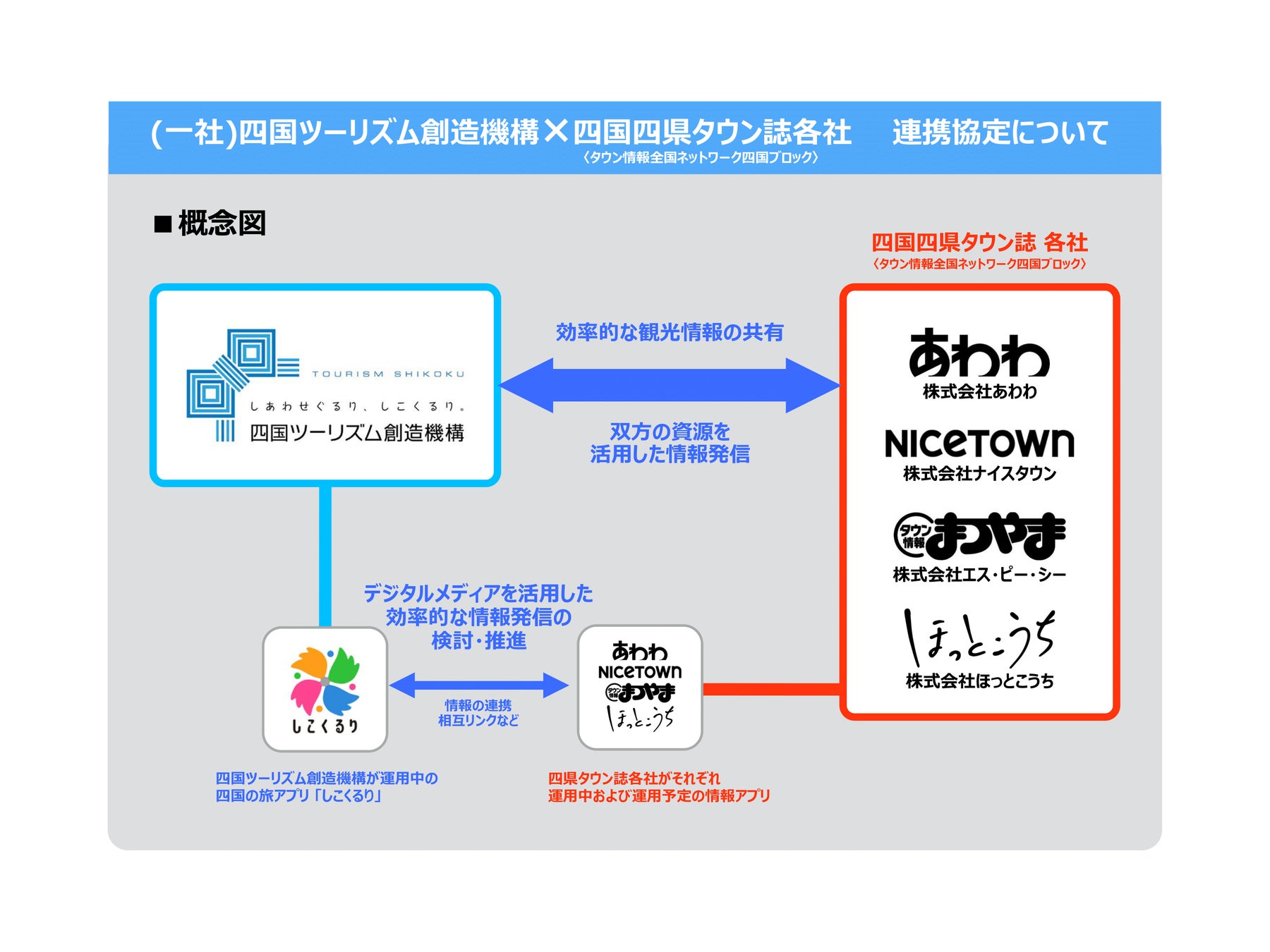この度、一般社団法人四国ツーリズム創造機構と四国4県タウン情報出版社(株式会社あわわ、株式会社ナイスタウン、株式会社エス・ピー・シー、株式会社ほっとこうち)間で、各社の資源を有効に活用した協働による取組みを推進し、デジタル技術等を活用した国内外及び四国在住者への効率的な情報発信及び四国への更なる誘客促進を目的とした包括連携協定を締結いたしました。