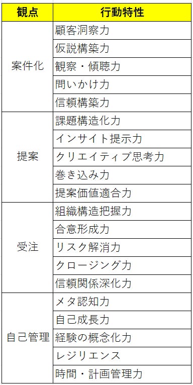 本研究で整理した20の行動特性は、営業力強化の効果的な手法を見出す指針と考えています。