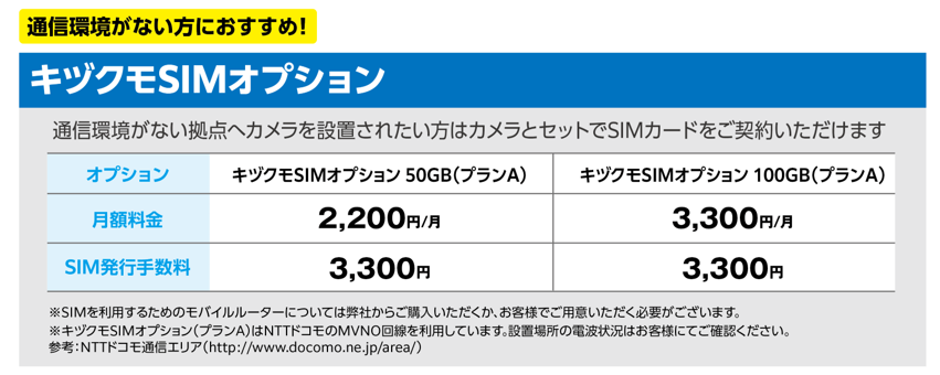 『キヅクモSIMオプション』は用途に応じてSIMカードの使用容量をお選びいただけます。50GBの場合は月額2,200円(税込)、100GBの場合は月額3,300円(税込)となります。
