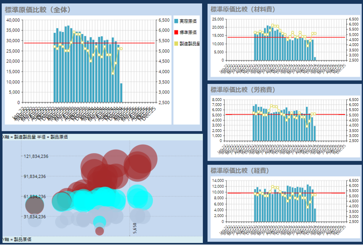 品目別に実際原価を標準原価と比較して分析することが可能です。同じ品目でも工場による原価差異の分析や、さらに工程単位での原価差異の分析が可能となります。これにより、原価改善が必要な品目や工場や作業工程で何をしていくかの示唆を得ることが出来ます。