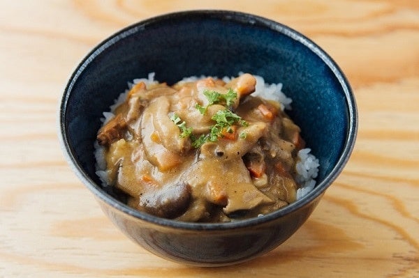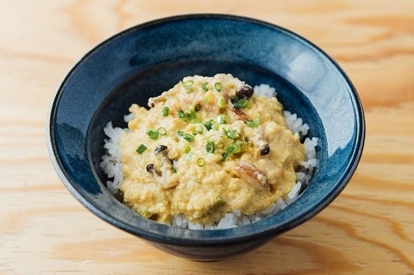 クラムチャウダーがどんぶりになった新しい1杯。あさり、エリンギ、しめじ、ベーコンなどの具材を加え、チーズと長崎県五島列島産の塩で味を調えました。クリーミーで満足感のある味わいです。ご飯だけでなく、パスタやうどんに合わせても。