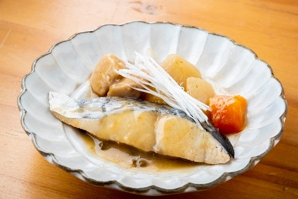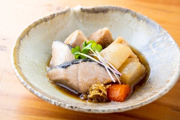 瀬戸内産さわらの味噌煮は、柔らかくしっとりとした味わい。実山椒の風味が爽やかに香ります。大根や里芋が甘めの味噌によく合います。