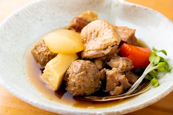 米ぬかで丁寧に下茹でし、柔らかく煮込んだ国産バラ肉と、国産野菜やこんにゃくを甘辛味に仕上げました。