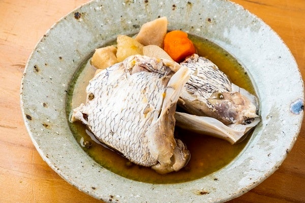 瀬戸内産天然真鯛の大きなカマは食べ応えがあり骨からの旨味が贅沢な味わいです。国産野菜とともに煮つけました。