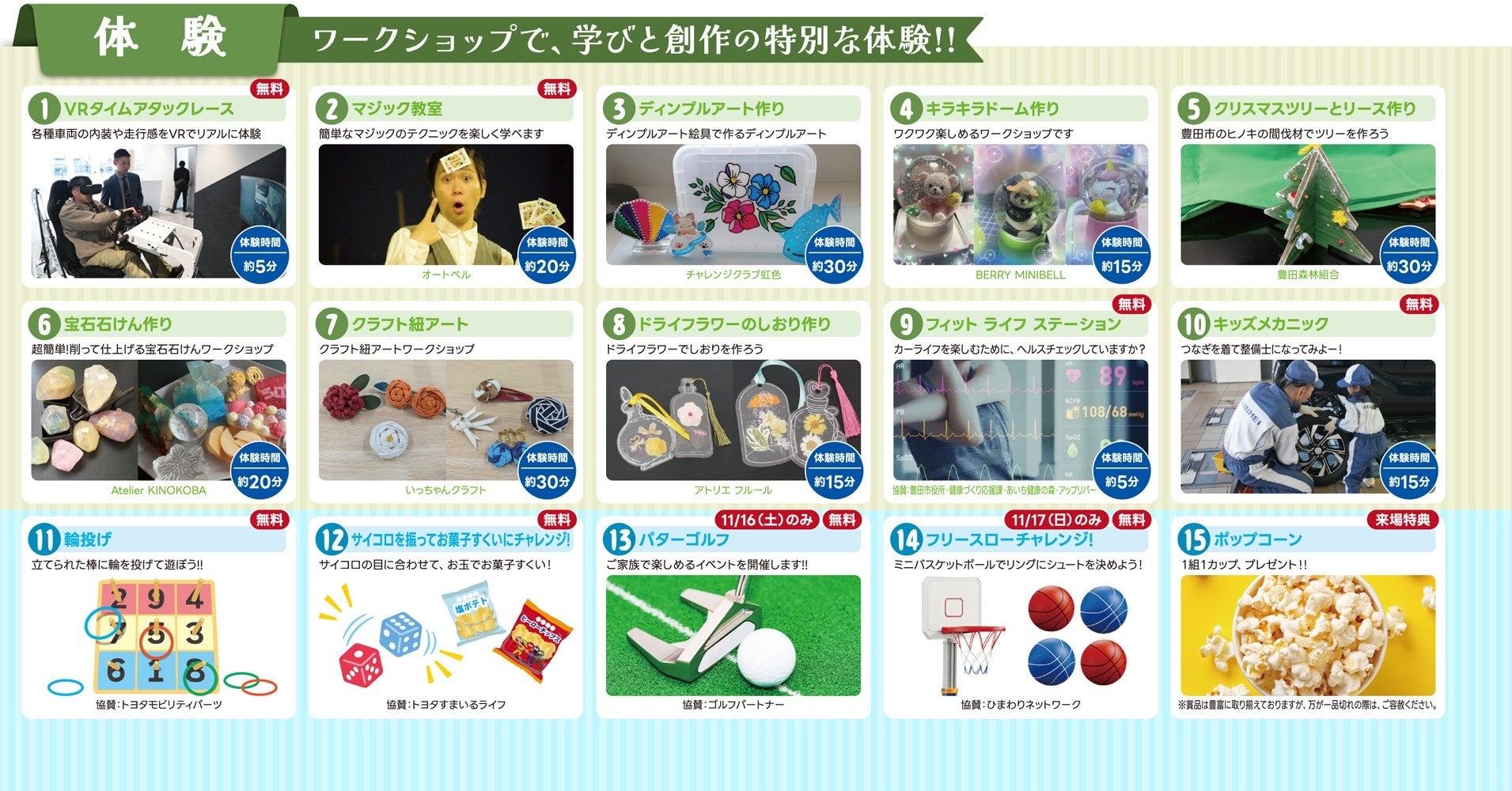 「キッズメカニック」「パターゴルフ」「マジック教室」「クリスマスリース作り」など特別な体験が盛りだくさん。会場で学びと創作の特別な体験をお楽しみください。