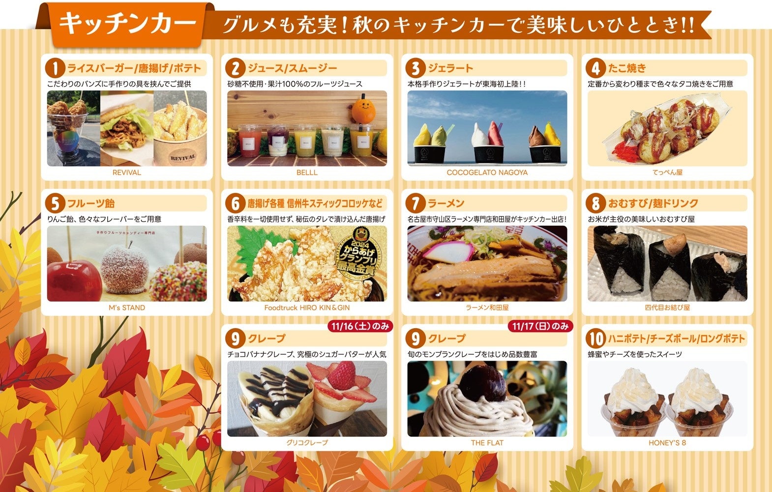「ライスバーガー」「たこ焼き」「クレープ」など、多彩なメニューが勢揃い。秋ならではのスイーツも楽しめます。美味しいひとときをお過ごしください。