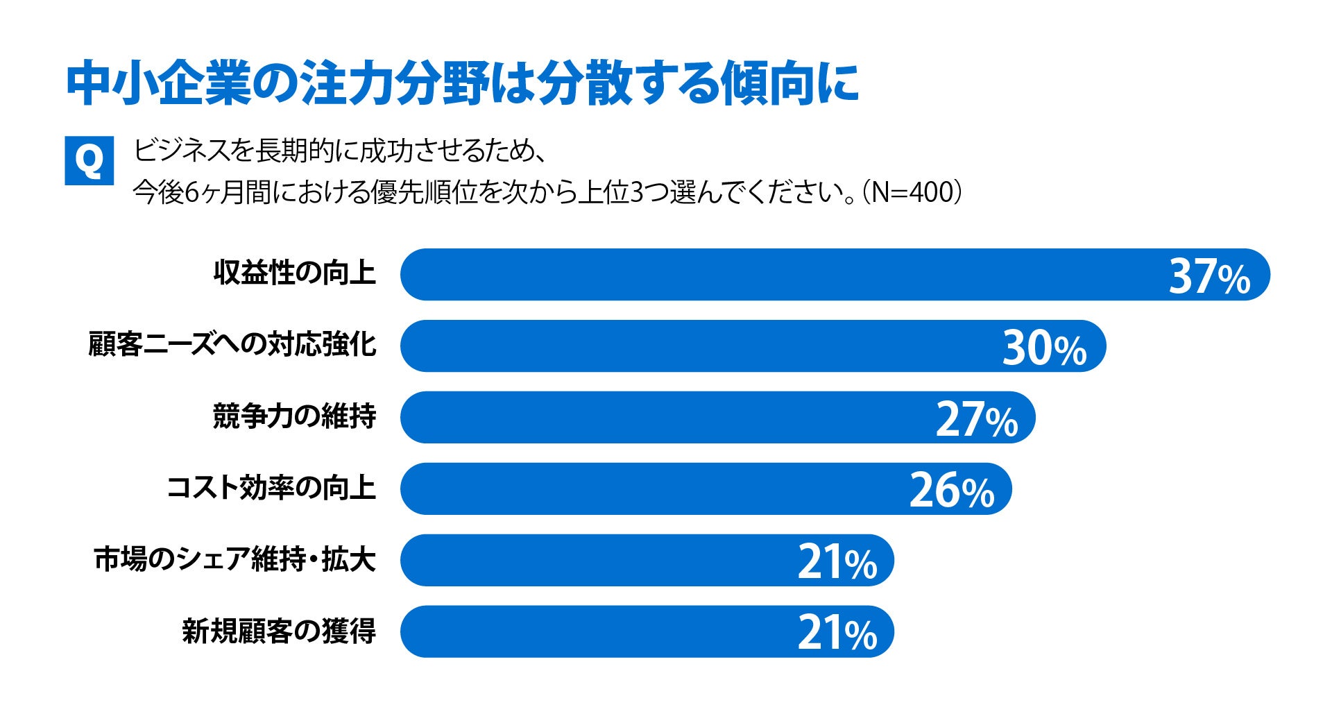 長期的なビジネス成功のために、今後6か月間で注力する領域としては、「収益性の向上」(37%)、「顧客ニーズへの対応強化」(30%)に続いて、「競争力の維持」(27%)、「コスト削減」(26%)ともっとも注力する領域が分散されています。このような取り組みを下支えするにあたって、「過去12か月間で、キャッシュフローと運転資金管理の重要性が増している」と答える中小企業が約半数(49%)を占めています。