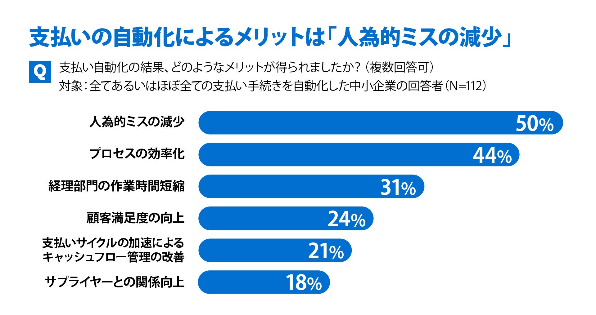 支払い処理をほぼ全て自動化した日本の中小企業のうちでは、「人為的ミスの減少」(50%)や、「効率性の向上」(44%)がメリットとして挙げられており、それに伴い、入金(42%)、出金(39%)の両面でさらなる自動化に意欲的な回答が寄せられました。世界的に経済の先行きが不透明な中、今後の事業成長の足がかりとして、自動化によるキャッシュフローの可視化が求められている様子が明らかとなりました。
