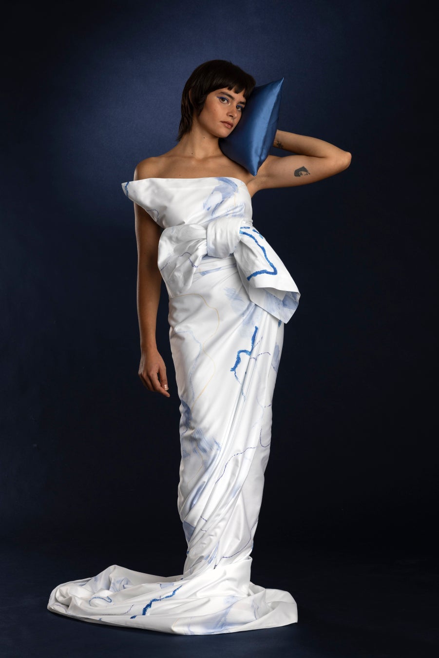 すでに豊かな質感、優雅さ、そして歴史を備えたイヴドロームのベッドリネンや洗練されたテキスタイルを”ファッション”の芸術を通じて、その本来の機能の超越を表現しました。