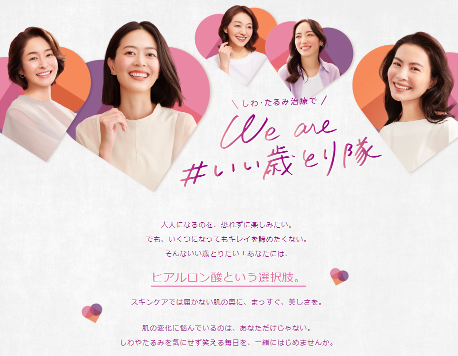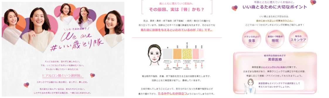 こうした美容医療の現状を受けて、当社では11月14日(アンチエイジングの日)に合わせ、いくつになってもキレイをあきらめたくない「いい歳とりたい」と思っているすべての女性たちをサポートする「いい歳とりたい」キャンペーンを始動。それぞれの肌への悩みに対して適切な美容医療をお届けするべく、「しわやたるみ」のメカニズムや適切な治療、施術にあたっての留意点などの情報をクリニックと協力してお届けしていきます。
