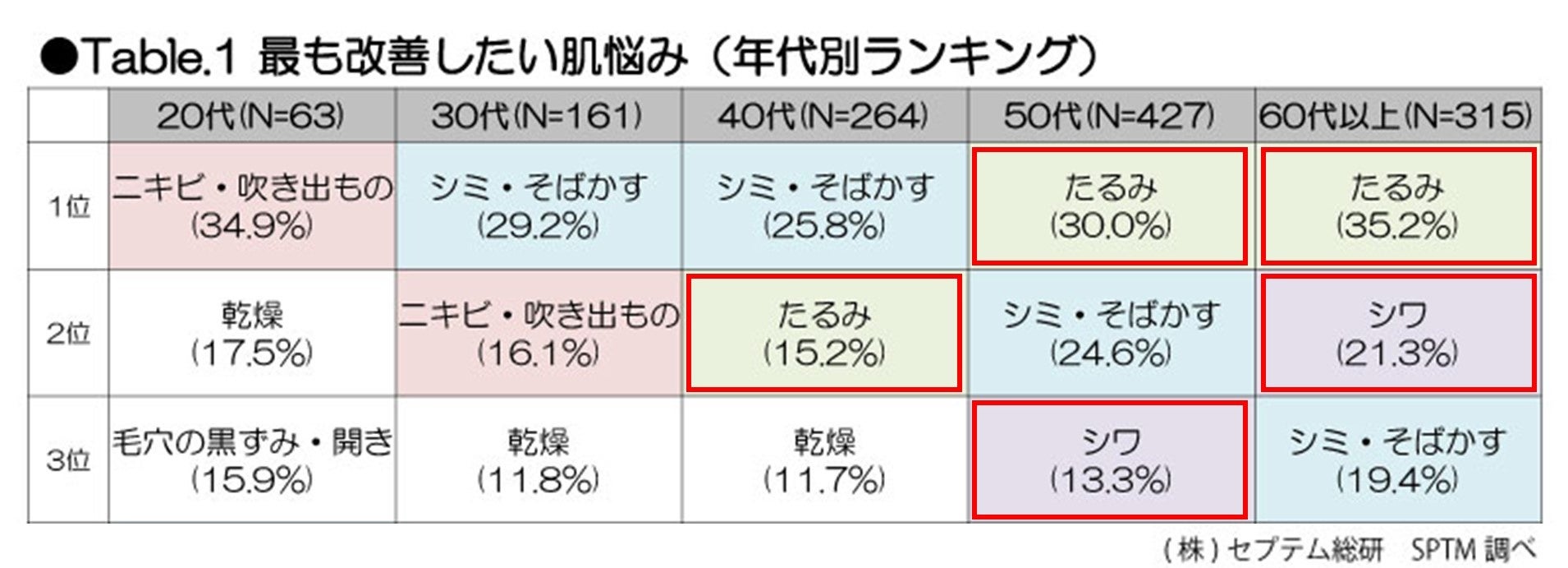 40代から「たるみ」「しわ」がTOP3、50代・60代以上では「たるみ」が1位に
